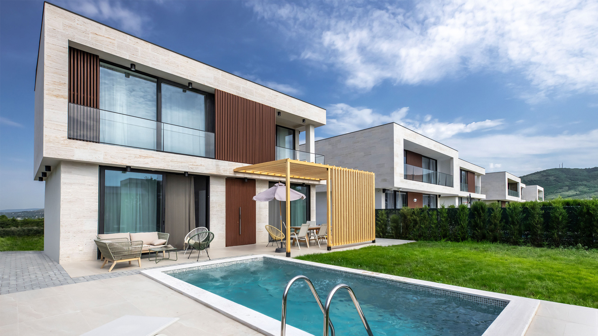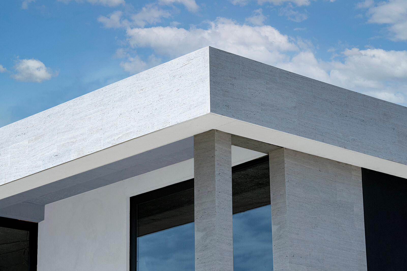ტრავერტინით და ბუნებრივი ხის მასალით მოპირკეთებული ფასადი