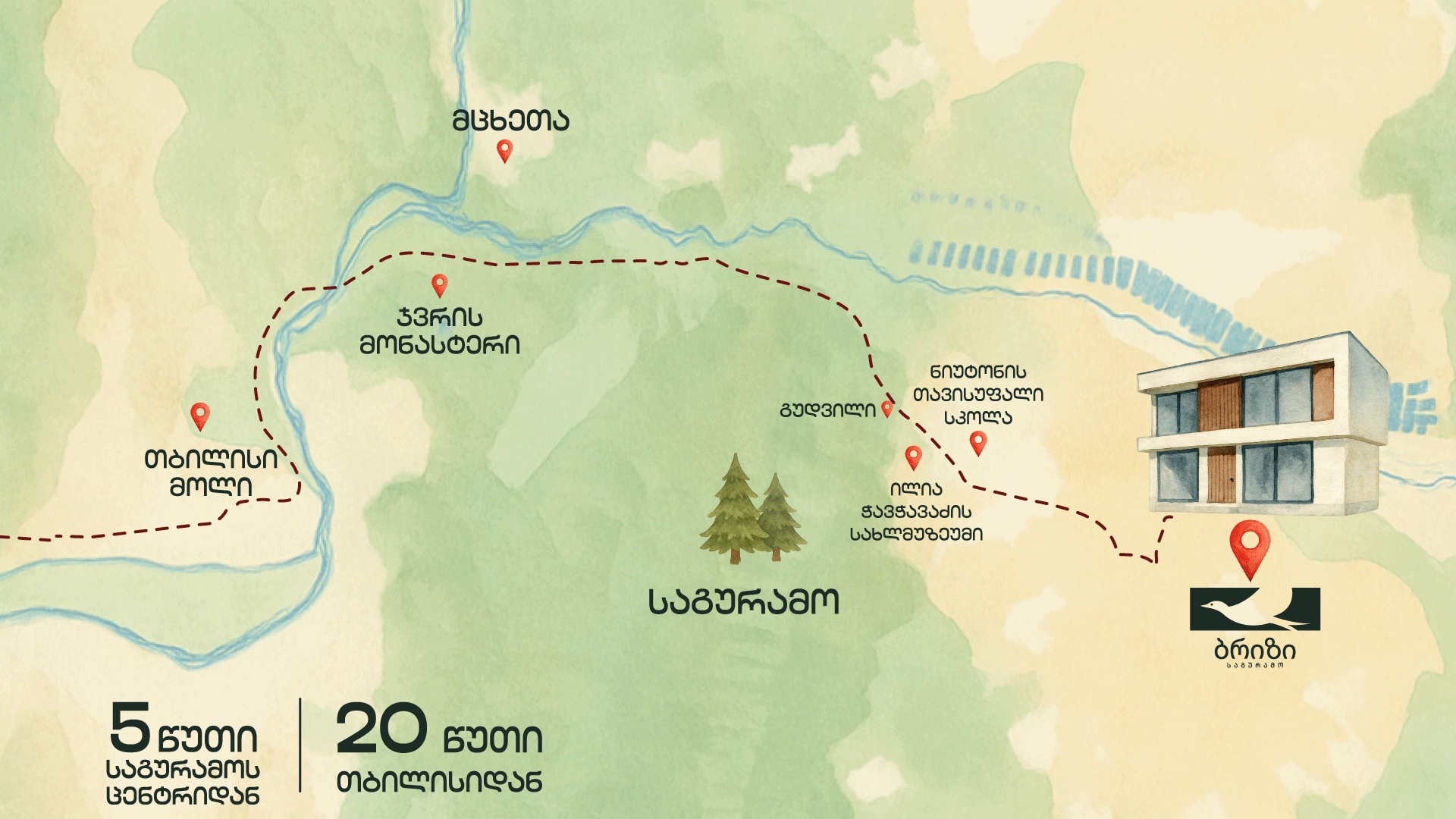 ბრიზი საგურამო თბილისიდან სულ რაღაც 20 წუთის სავალ გზაზე მდებარეობს. ჩვენი პროექტის ლოკაცია შერჩეულია მათთვის, ვისთვისაც დრო უმნიშვნელოვანესი რესურსია.